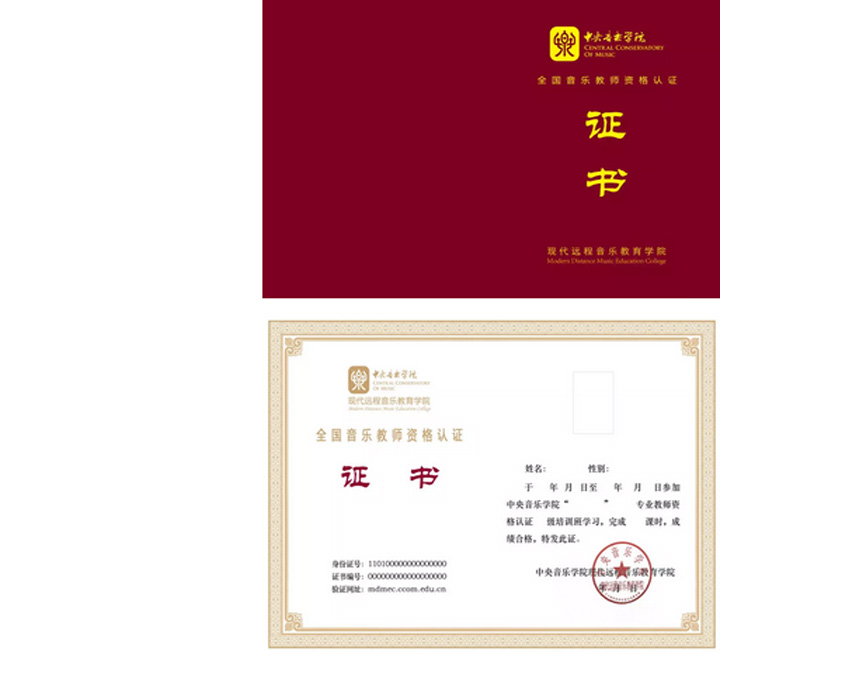 参加面授培训并考核通过者将获得由中央音乐学院现代远程音乐教育学院颁发的”音乐教育“(专业技巧:钢琴)标准级教师资格证书